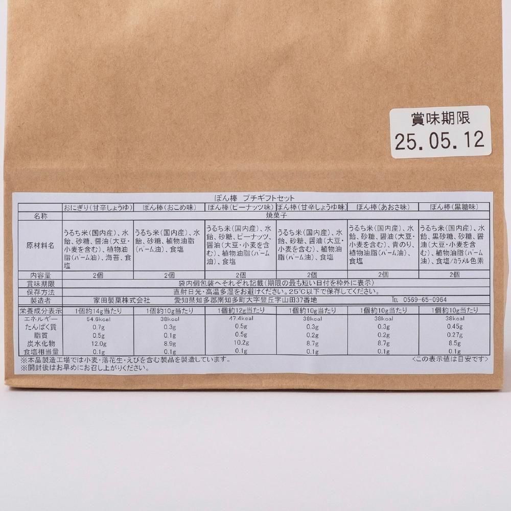 甘辛しょうゆ味2本、黒糖味2本、プレーン味2本、青さ味2本、ピーナッツ味2本、海苔つきおむすび2個の12個セットです。